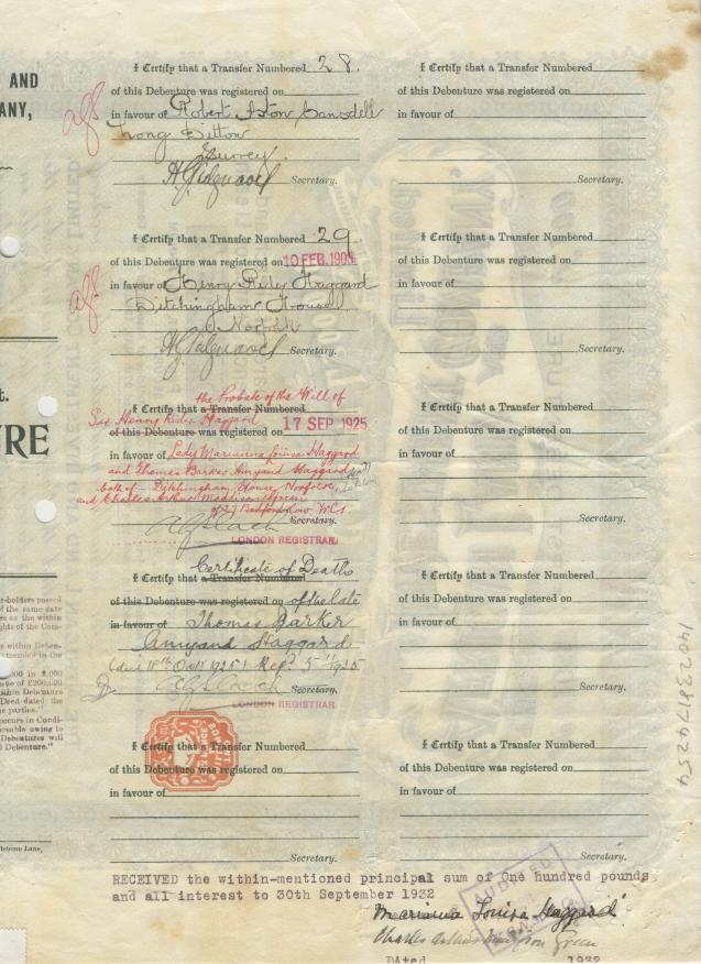 Transfer 29 to Henry Rider Haggard of Ditchingham House, Norfolk